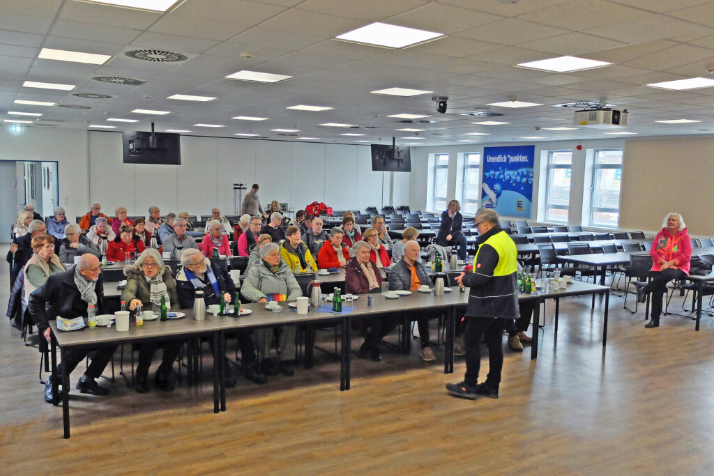 Und wieder einmal waren die „Macher“ unterwegs, begleitet von der Vorsitzenden des Hauses, Elisabeth Schlömer. Dieses Mal ging es nach Wiefelstede zur Betriebsbesichtigung des dortigen Zentrallagers der Edeka. Hier lagern auf 111.000 m2 Waren für ganz Norddeutschland bis hin nach Berlin. Dabei ist Regionalität ein großes Ziel. Nach einem kleinen Frühstück begrüßten Timo Feddersen und Marko Seidel die 50 Interessierten, gaben spannende Einblicke in die fast 120jährige Geschichte und heutige Logistik von Edeka und begleiteten die Gruppe sachkundig durch verschiedene Abteilungen des Großhandelslagers – bis hinein in die „Kühlkammer“ von -23°. Zum Aufwärmen gab es danach für alle in Westerstede ein deftiges Grünkohlessen.